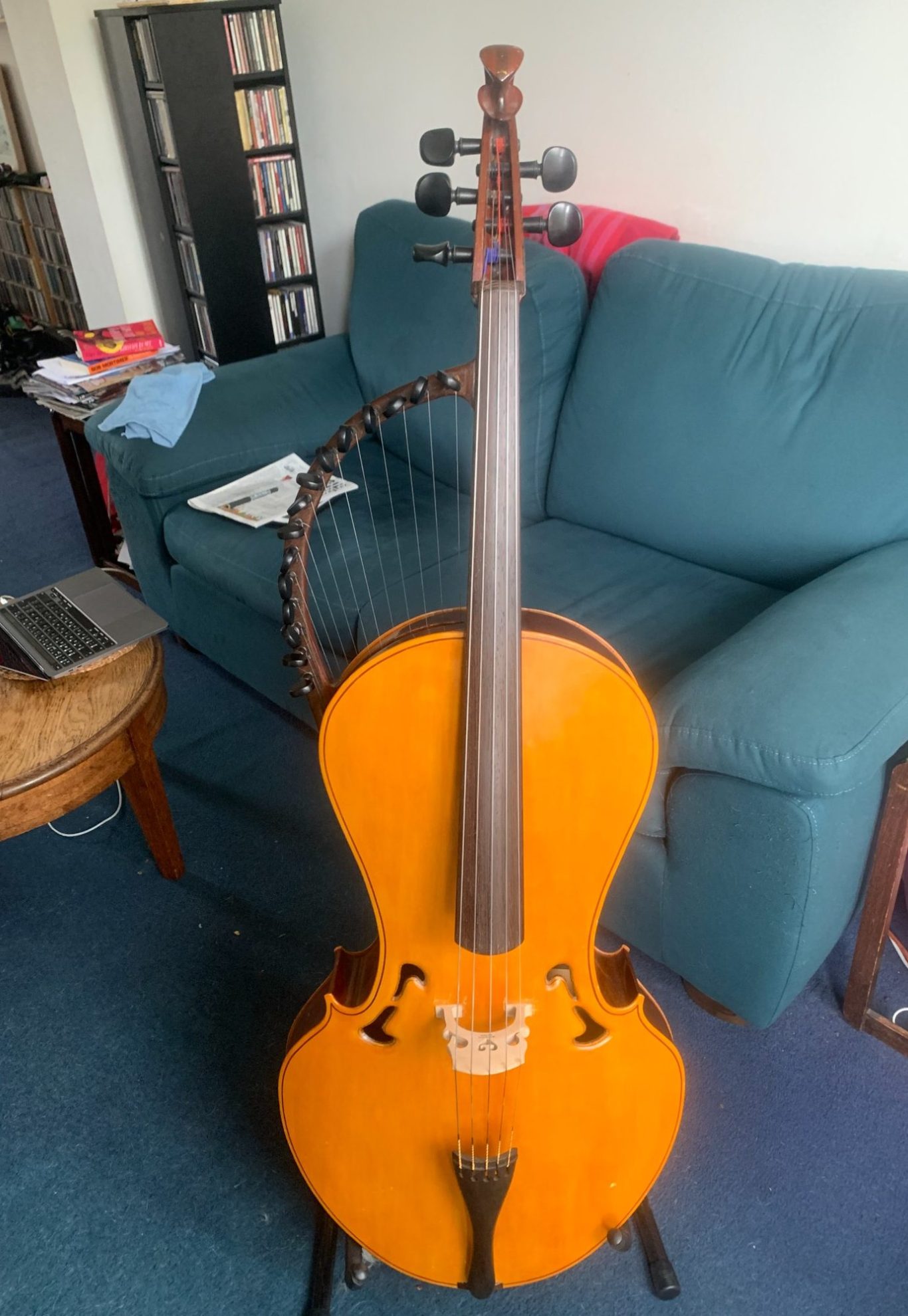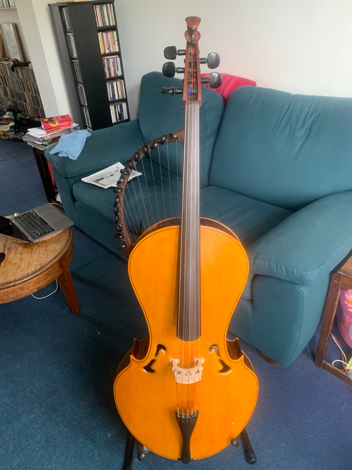 Once I'd acquired it, I needed to learn to play it. I'd had a yen to own a 5-string cello for a long time (partly in order to play Bach's Cello Suite No. 6, which is written for a 5-string instrument) and naively thought it would be like playing a normal cello but with an extra string. It was more complicated than this! Not simply becasue of the unconventioanl design of the instrument but because all my muscle memory of how much to move my arms and fingers to cross over four strings was all slightly out when I had to navigate five: I spent a lot of time hitting the wrong string beore I managed to recalibrate myself.