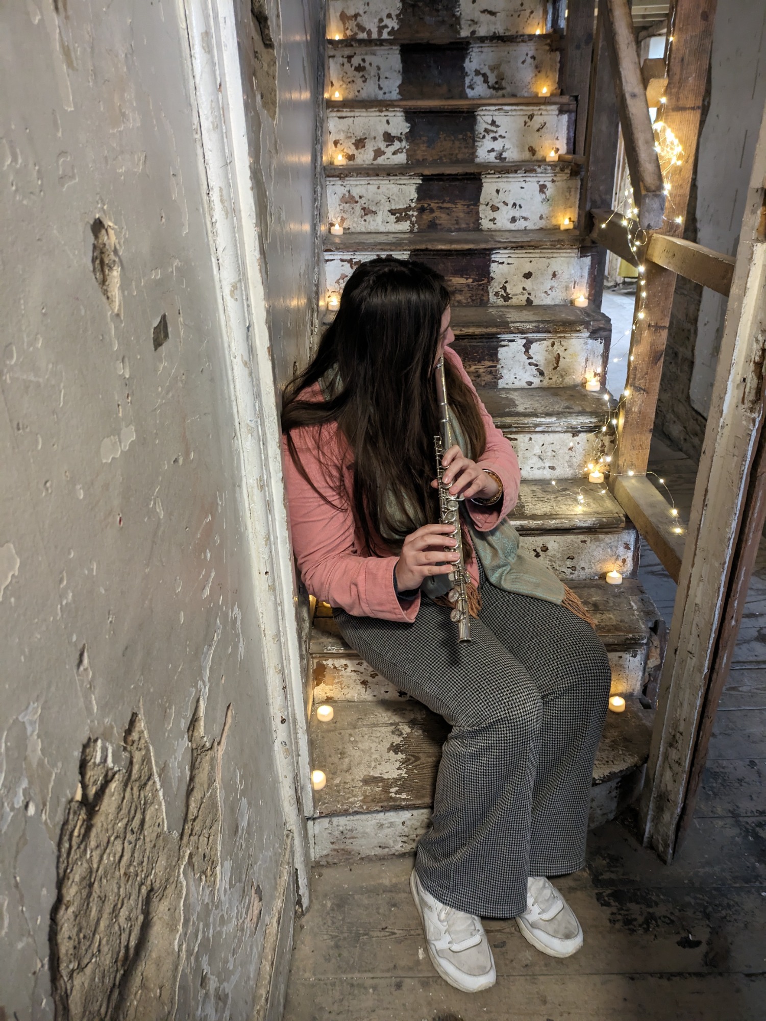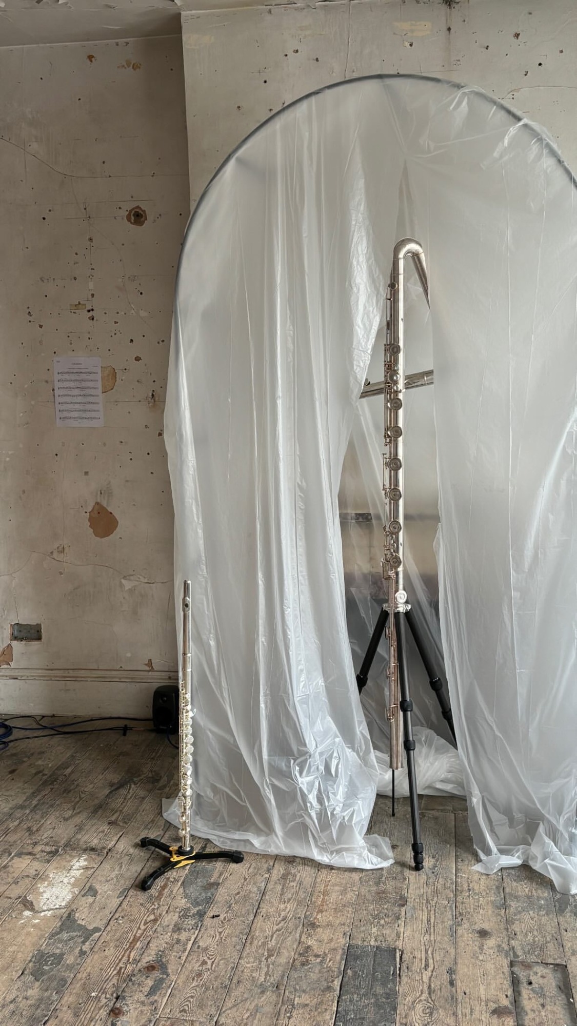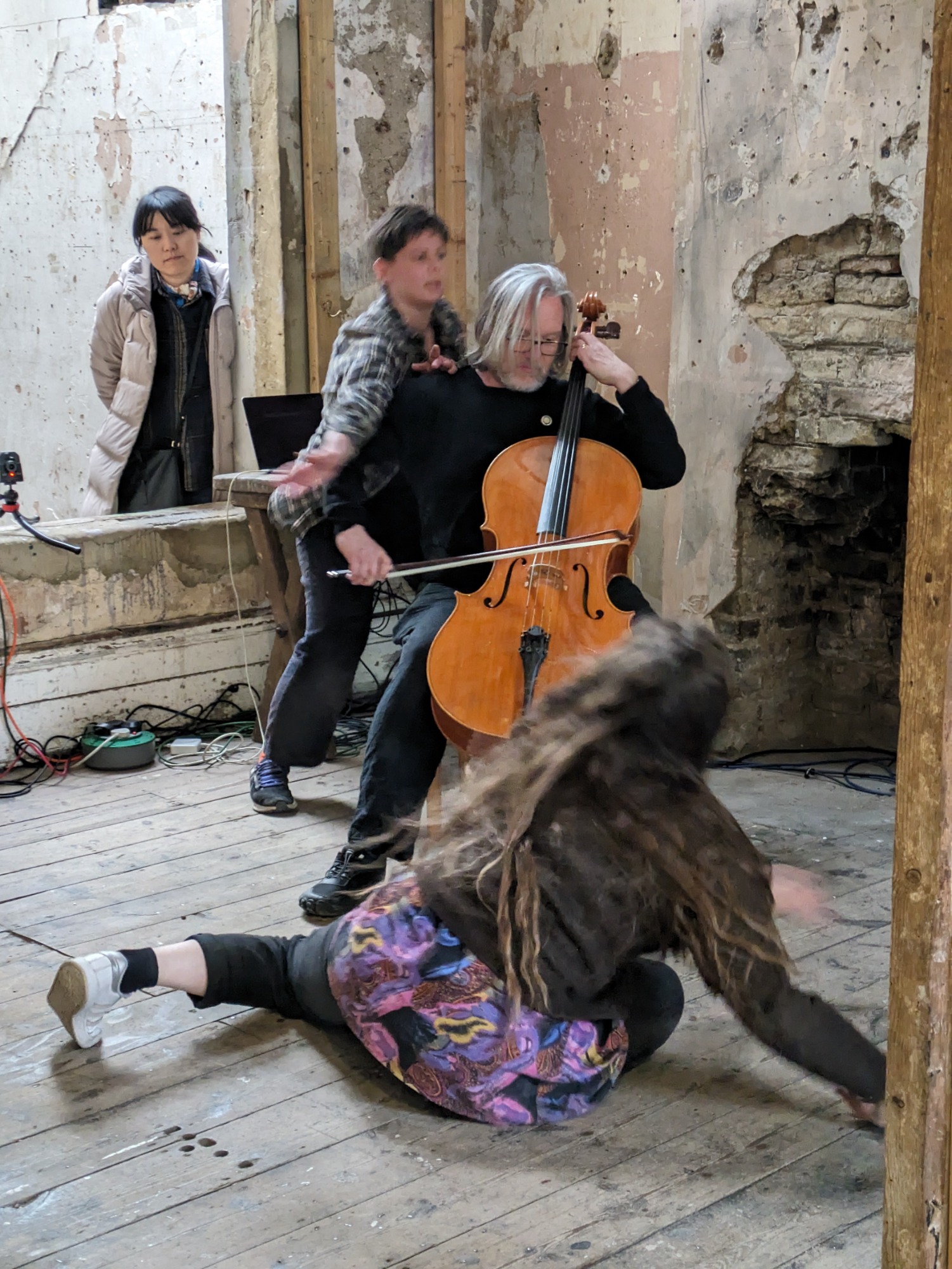 When lockdowns ended and in-person events became possible again I presented Ouroboros as an installation and performance at Safehouse 1, Peckham for the final presentation for my PhD. Safehouse being a derelicy Victorian terrace house this fitted in with the domestic theme that underlines the project. It ran in the afternoon as an 8-channel sound installation, with images and lights on the walls nd Carla's contrabass flute present as an object, and then in the evening evolved into a performance with dancers, musicians, and finally the audience all joining in: a dissolving of the roles of artist/performer/audience into a community.