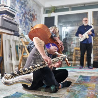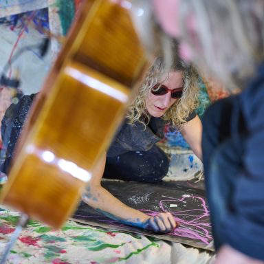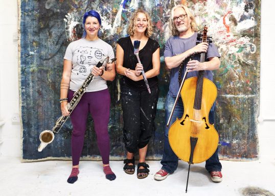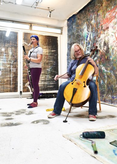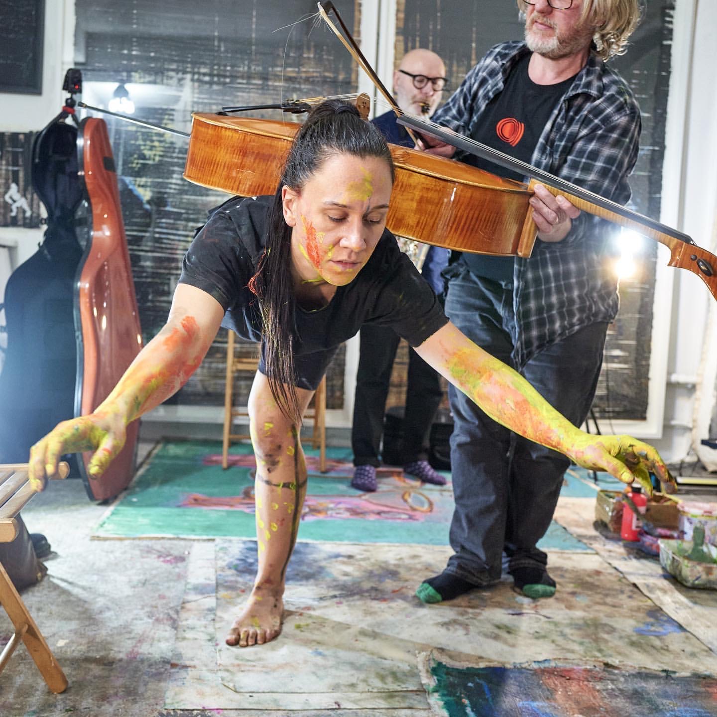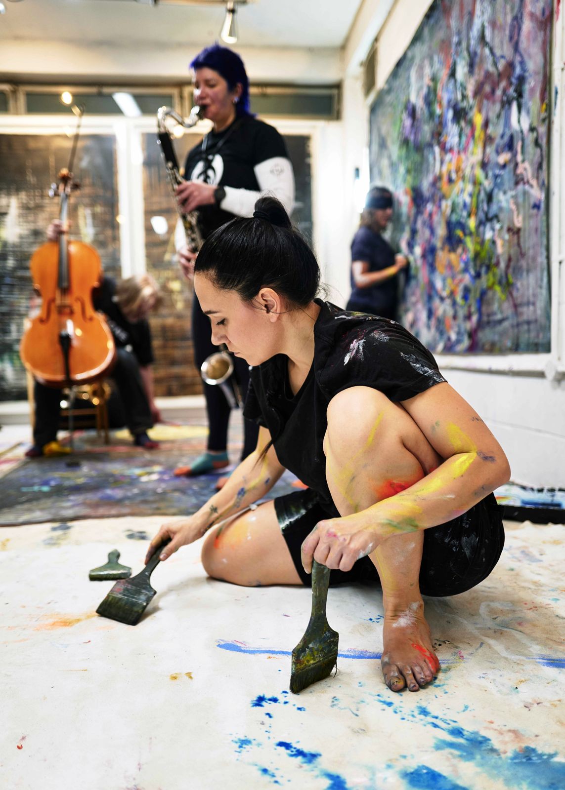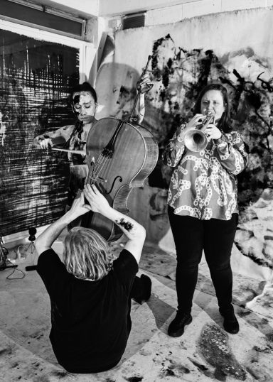 I've been collaborating with painter Claire Zakiewicz since 2021, exploring our shared interest in painting and musicking as embodied, entangled movement. From 2021-2025 we worked with the bass clarinettist Emily Suzanne Shapiro (who I've been playing with since 2013), regularly joined by dancer Petra Haller and since 2024 guitarist Georgia Morgan Turner. Since Emily's return to Canada in 2025, Claire, Georgia and I have been working as a trio. Other musicians who have joined us include Loz Speyer, Charlotte O'Keefe, Rachel Musson, Abe Mamet, Sofia Vaismann-Maturana and Anthony Osborne. Most of our sessions are documented by the brilliant photographer Chris Freeman, and recorded by me.