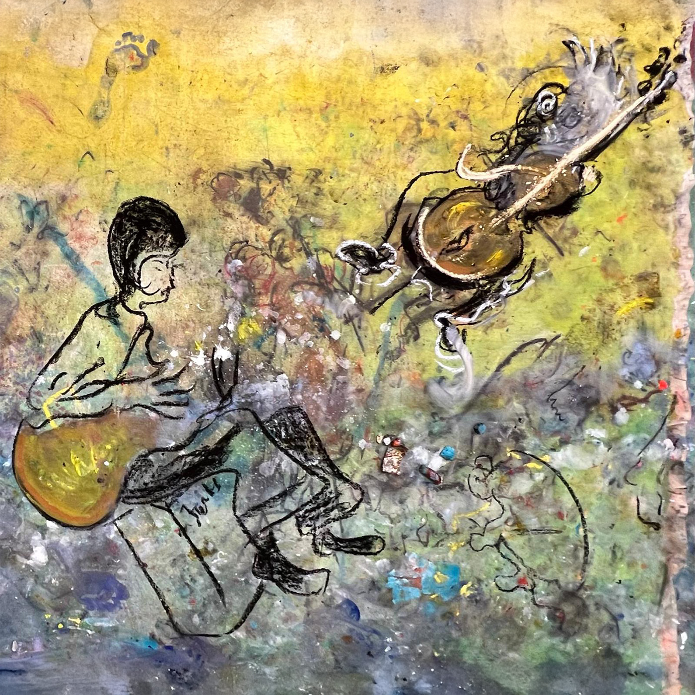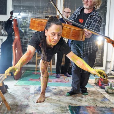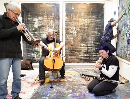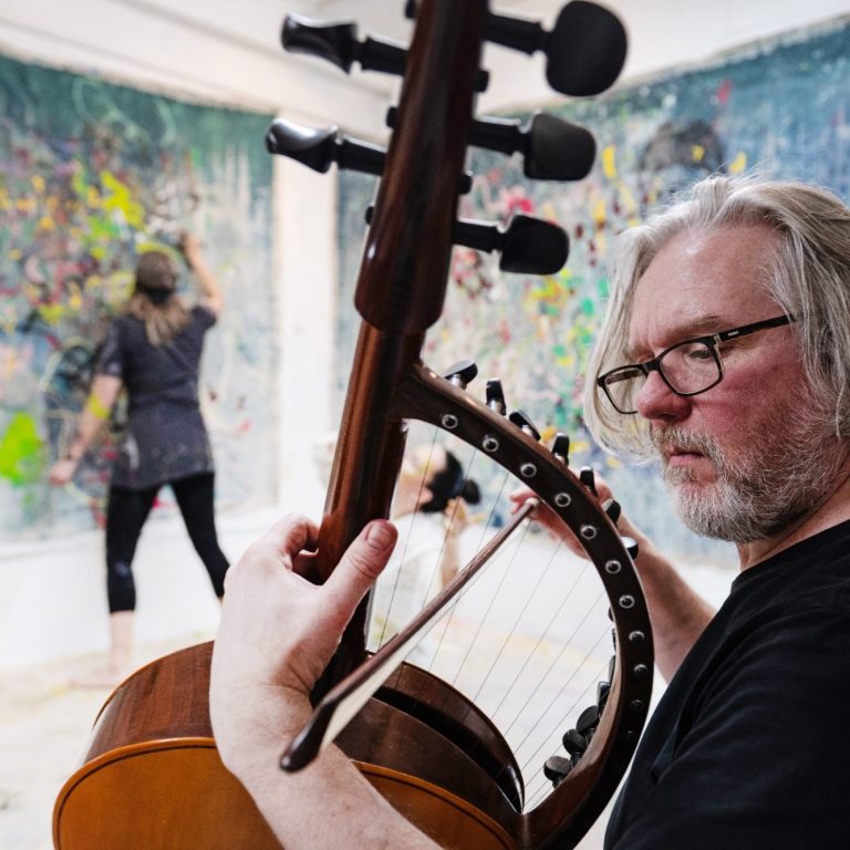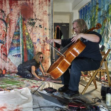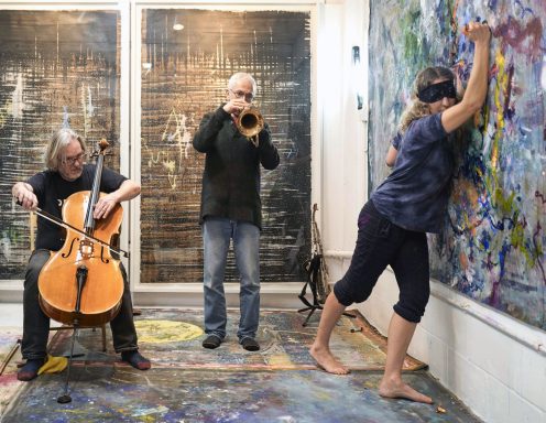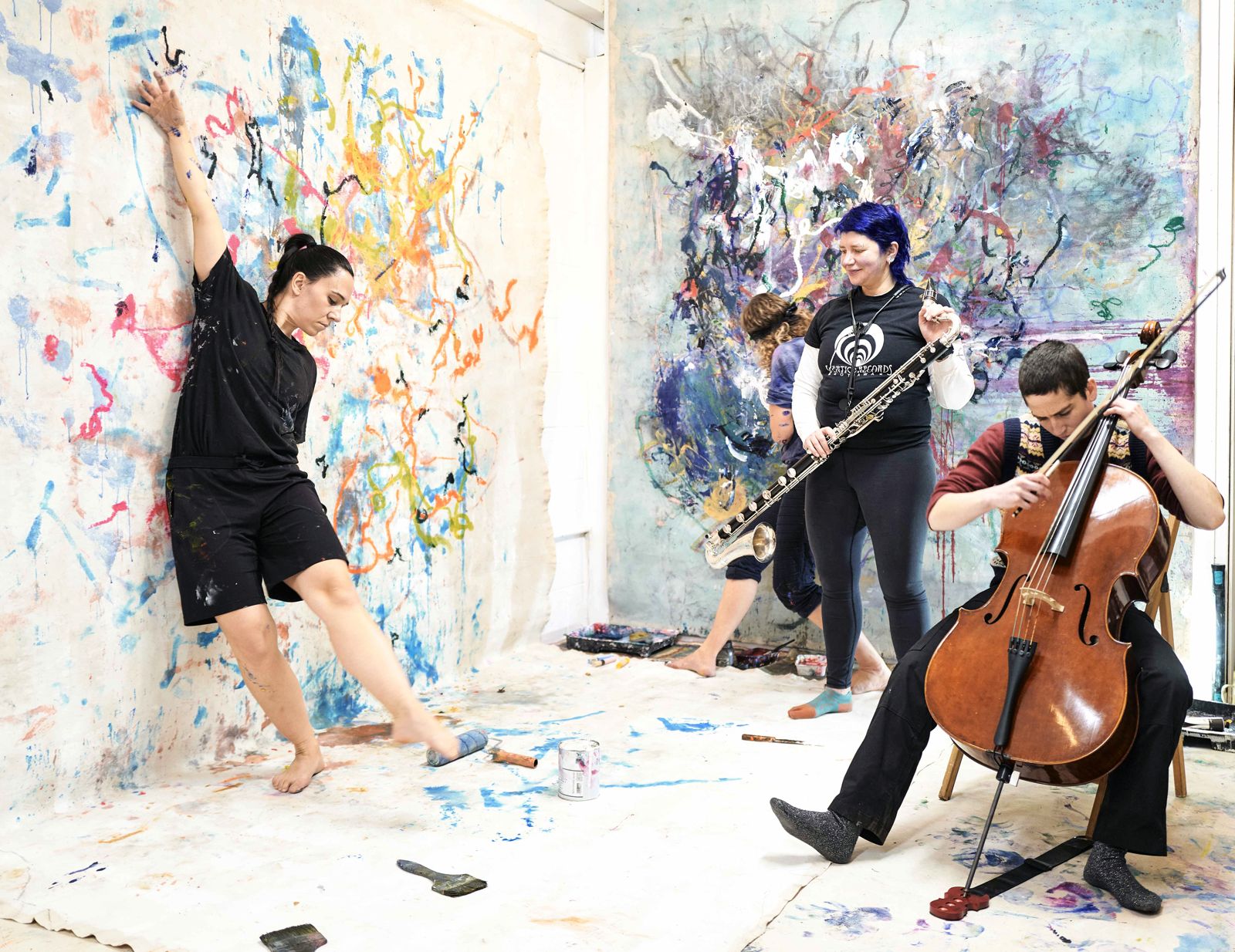 I've been collaborating with painter Claire Zakiewicz since 2021, exploring our shared interest in painting and musicking as embodied, entangled movement. From 2021-2025 we worked with the bass clarinettist Emily Suzanne Shapiro (who I've been playing with since 2013), regularly joined by dancer Petra Haller and since 2024 guitarist Georgia Morgan Turner. Since Emily's return to Canada in 2025, Claire, Georgia and I have been working as a trio. Other musicians who have joined us include Loz Speyer, Charlotte O'Keefe, Rachel Musson, Abe Mamet, Sofia Vaismann-Maturana and Anthony Osborne. Most of our sessions are documented by the brilliant photographer Chris Freeman, and recorded by me.